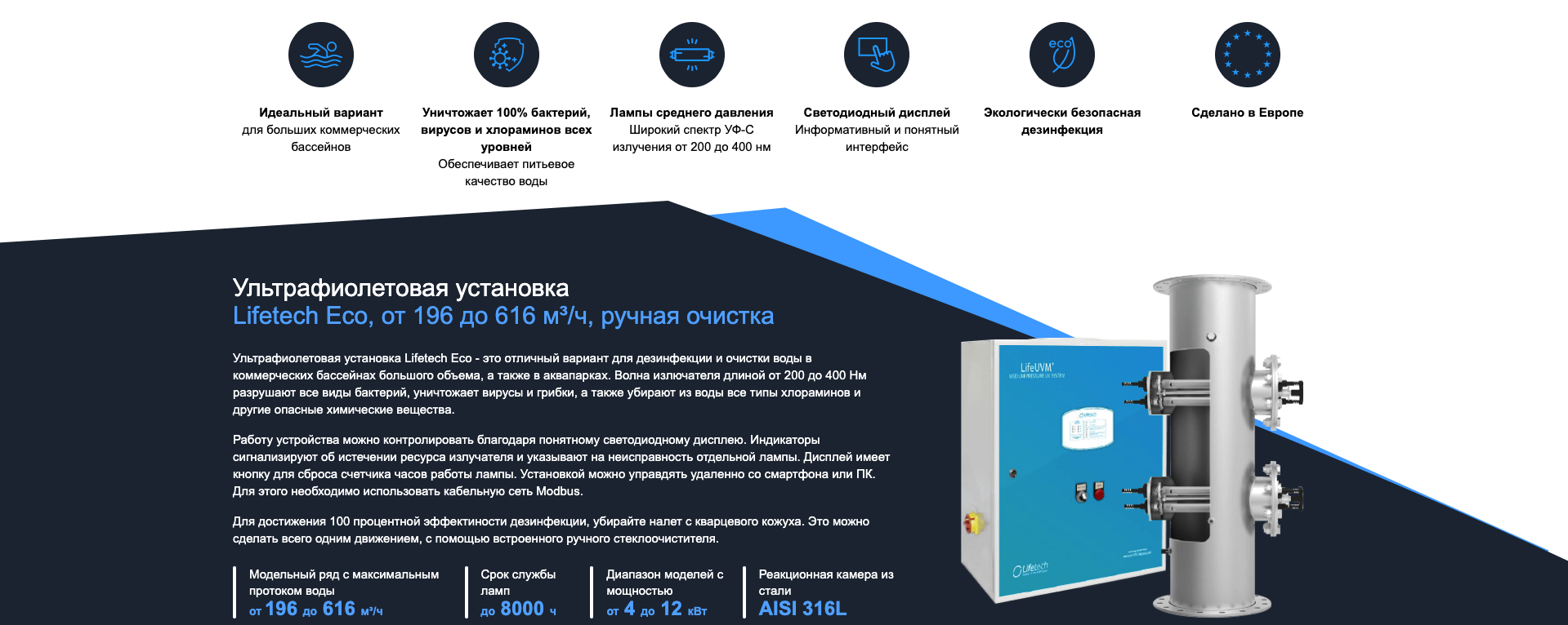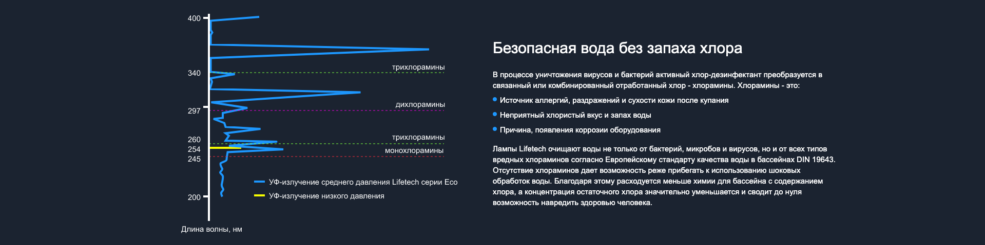 По немецким нормативам DIN (DIN 19643) это единственная разрешённая УФ технология, которая убедительно снижает уровень связанного хлора.