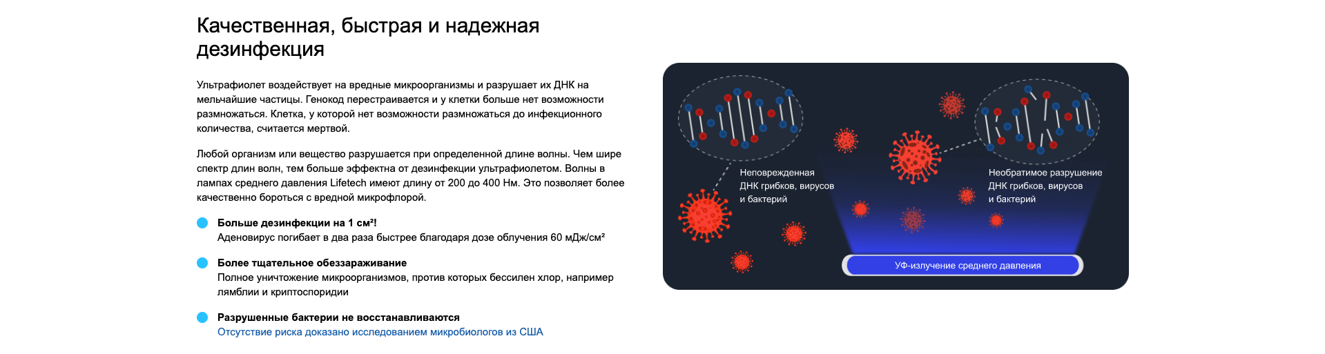 ПРЕДОТВРАЩЕНИЕ реактивации бактерий постоянное обеззараживание очищенной воды. ДЕЗИНФЕКЦИЯ воды и удаление комбинированного хлора одновременно. Благодаря уникальной технологии LifeAGE® срок службы УФ-лампы может достигать 18 000 рабочих часов.