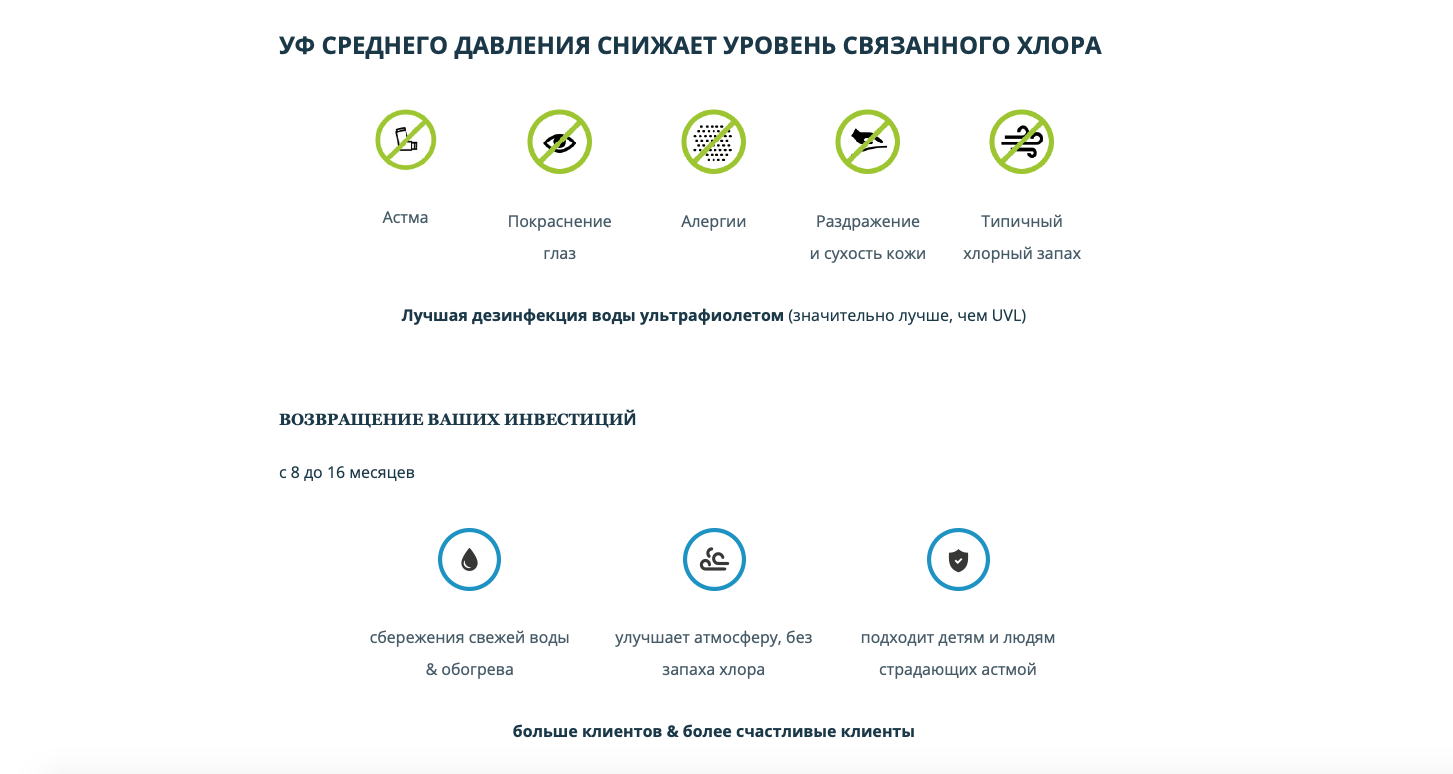 В любой отрасли промышленности, где УФ используется для дезинфекции воды или жидких отходов, оператор должен быть уверен в том, что очистка воды происходит постоянно – именно поэтому необходимо использоваться УФ системами среднего давления. Последнее постановление немецкого стандарта DIN 19643 чётко и ясно предупреждает: Только УФ системы среднего давления могут правильно дезинфицировать воду в плавательных бассейнах и понизить уровень комбинированного хлора. УФ системы низкого давления не подходят для использования в данных процессах.